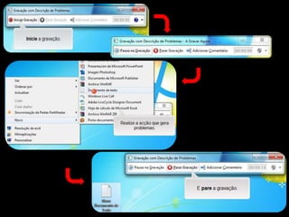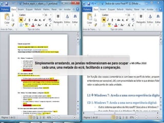 O documento descreve as principais mudanças no Windows 7, incluindo o FLiP 3D para visualização rápida de janelas, controles parentais melhorados e o uso de várias janelas do mesmo programa. Também discute listas de atalhos, comparar documentos e problemas de suporte.