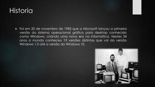 O documento descreve a história do sistema operacional Windows da Microsoft desde sua primeira versão lançada em 1985 até a versão mais recente, o Windows 10. Começou como um sistema gráfico para desktop e passou por várias atualizações ao longo de 34 anos para melhorar a interface gráfica, segurança, desempenho e suporte a novos dispositivos. O Windows tornou-se o sistema operacional dominante e é usado em computadores pessoais e corporativos em todo o mundo.