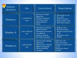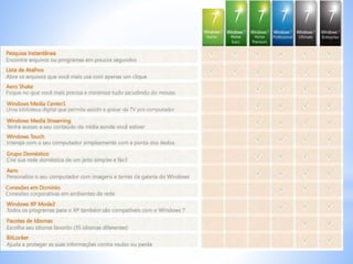 O documento discute as diferenças entre as versões do Windows 7, 8.1 e 10, focando no Menu Iniciar, ferramentas de inicialização rápida e recursos de segurança como Firewall e antivírus.