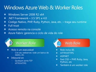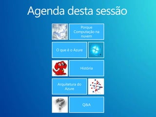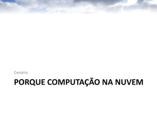 Este documento resume uma apresentação sobre computação em nuvem usando o serviço Windows Azure da Microsoft. Ele descreve como a demanda crescente por serviços online levou as empresas a adotarem soluções de nuvem para melhor escalabilidade e disponibilidade. O Windows Azure oferece infraestrutura e plataforma como serviço para desenvolvimento e hospedagem de aplicações na nuvem da Microsoft.