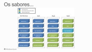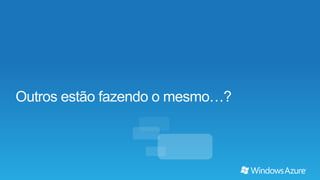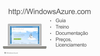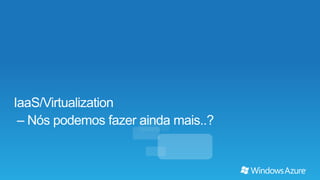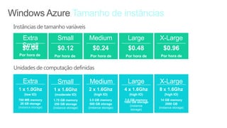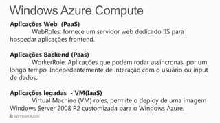 O documento discute como a plataforma Windows Azure da Microsoft pode fornecer uma infraestrutura de nuvem escalável e de baixo custo para hospedar aplicações complexas. Apresenta os principais componentes da plataforma como VMs, armazenamento e serviços de nuvem que permitem que as aplicações se adaptem dinamicamente à demanda. Também destaca como a plataforma pode ajudar a reduzir custos de TI ao compartilhar recursos entre aplicações.