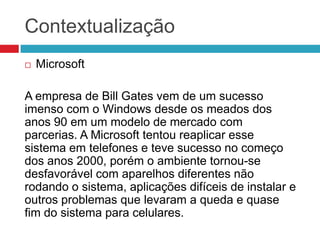 O documento descreve o sistema operacional Windows Phone da Microsoft, seu histórico desde o fracasso do Windows Mobile, o lançamento do Windows Phone 7 em 2010 como uma reinvenção do sistema móvel da empresa, e seu crescimento recente no mercado especialmente na América Latina, onde agora é o segundo sistema operacional mais usado, atrás apenas do Android.