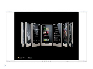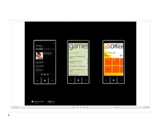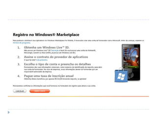 O documento apresenta o Windows Phone 7, discutindo suas vantagens como interface simples e rica, suporte a acelerômetro e APIs de posicionamento. Também aborda como desenvolver aplicativos para a plataforma usando Silverlight e XNA, e como publicá-los no MarketPlace.