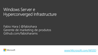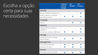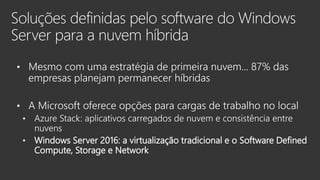 O documento discute as ofertas da Microsoft para virtualização e computação definida por software, incluindo o Windows Server 2016, Azure Stack e Soluções definidas por software do Windows Server. Essas soluções permitem desenvolvimento ágil, eficiência operacional, recursos on-demand e escalabilidade independente de computação e armazenamento.