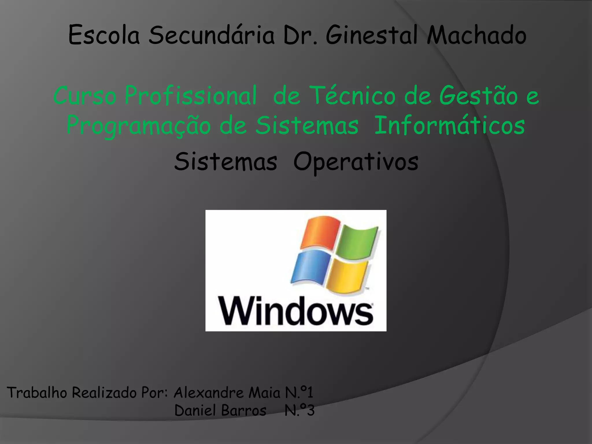 O documento descreve o sistema operacional Windows, começando com sua definição e origem do nome. Detalha a evolução histórica do Windows desde sua primeira versão em 1985 até as versões mais recentes. Lista características-chave do Windows como ambiente gráfico, multitarefa, nomes de arquivos longos e suporte a arquiteturas de 32 e 64 bits.