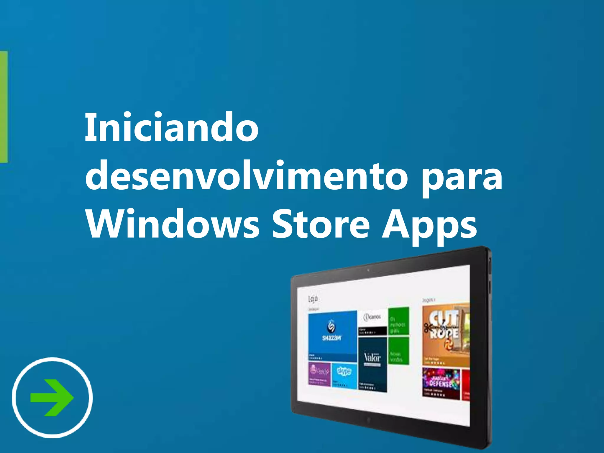O documento discute o desenvolvimento de aplicativos para Windows Store, incluindo ferramentas necessárias como Visual Studio 2012 e Windows Developer Account. Também aborda a evolução do Windows ao longo do tempo, a popularidade do sistema operacional e as vantagens de desenvolver para a plataforma Windows 8 devido ao crescimento econômico do mercado.