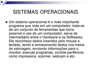 O documento descreve o que é um sistema operacional, suas principais funções como intermediar hardware e software, executar programas e controlar periféricos. Também lista e explica brevemente alguns dos sistemas operacionais mais conhecidos, como Windows, Linux, DOS e suas respectivas versões.