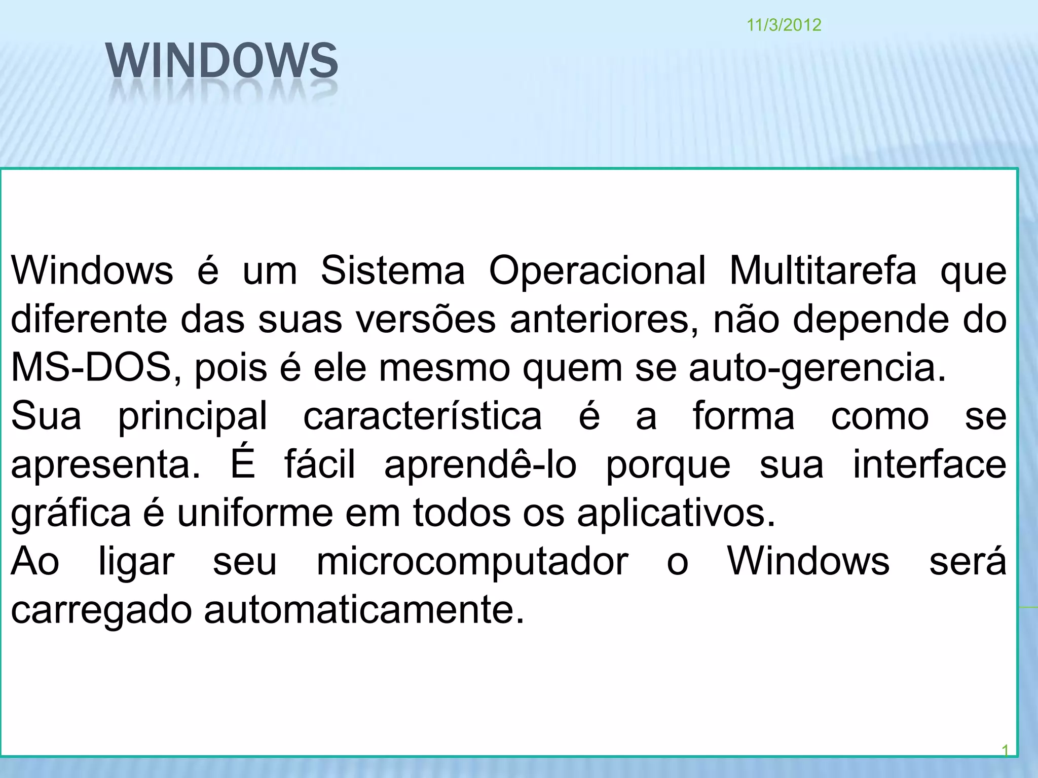 O documento fornece informações sobre o sistema operacional Windows e sua interface gráfica, além de detalhar a evolução dos computadores e seus principais componentes hardware e software.