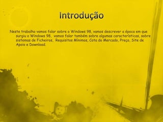 IntroduçãoNeste trabalho vamosfalar sobre o Windows 98, vamos descrever a época em que surgiu o Windows 98, vamos falar também sobre algumas características, sobre sistemas de Ficheiros, Requisitos Mínimos, Cota do Mercado, Preço, Site de Apoio e Download.