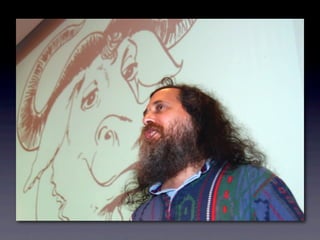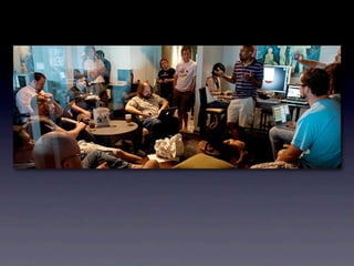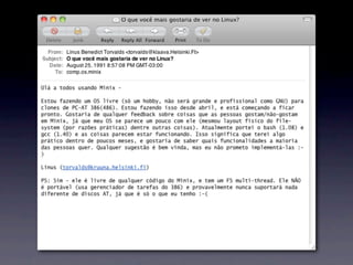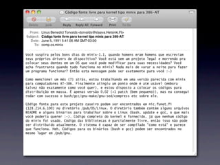 O documento discute a importância do desenvolvimento de software open source, enfatizando a experimentação, feedback rápido e descentralização como práticas essenciais. Ele critica a abordagem tradicional de gerenciamento e destaca o valor de interações humanas e colaboração em ambientes ágeis. A apresentação inclui citações de figuras influentes como Linus Torvalds e Andrew Tanenbaum sobre a evolução do desenvolvimento de software.