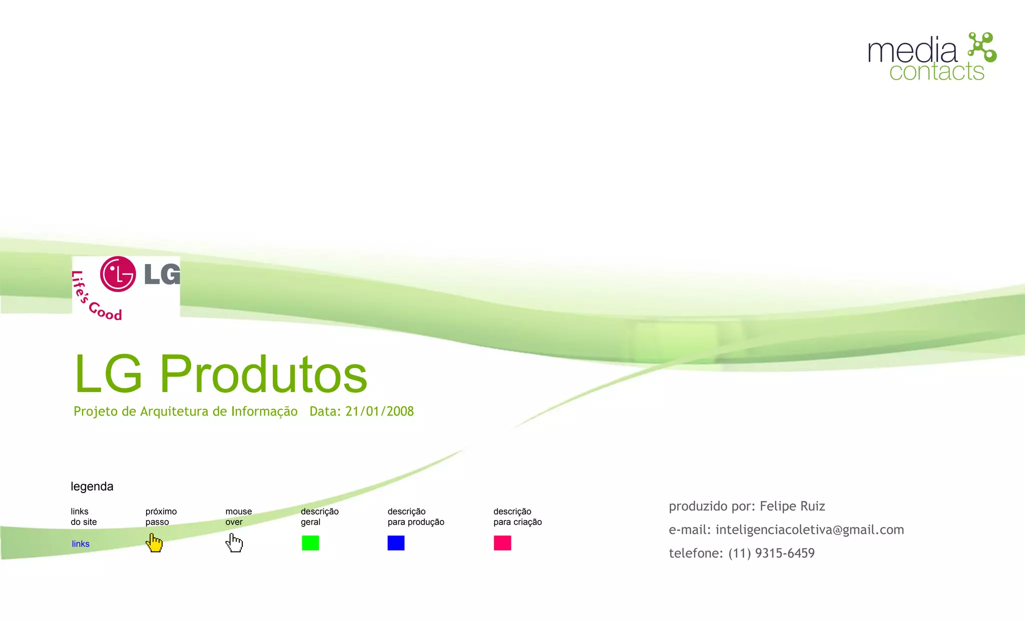 O documento apresenta wireframes para um site corporativo da LG com seções dedicadas aos principais produtos da marca (Home, Theater, Informática e Telefonia Móvel). Cada seção lista os produtos em uma roleta interativa, com imagens e detalhes. Ao clicar em um produto, são exibidos seus detalhes técnicos e a opção de ir para a página do produto no site da LG.
