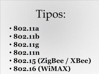 O documento discute os padrões de rede sem fio IEEE 802.11, detalhando suas versões desde 1997, como 802.11a, b, g e n, com diferentes frequências, modelos e velocidades máximas. Destaca a evolução da tecnologia e a popularidade de cada padrão, especialmente o 802.11b, g e n, que são os mais utilizados atualmente. Além disso, menciona a introdução do padrão 802.15 com velocidades significativamente mais baixas.