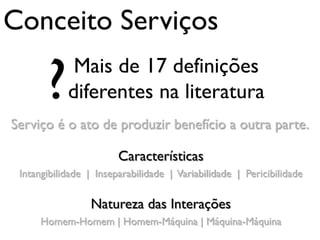 O documento discute o design de serviços para melhorar a experiência dos clientes e construir serviços inovadores. Ele aborda conceitos como definições de serviço, características, resultados, lógica e complexidade de serviços. Também apresenta os objetivos, perímetros e processo de design de serviços.