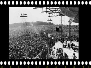 O documento descreve o histórico Festival de Woodstock de 1969, que reuniu cerca de 500 mil pessoas em um fim de semana em uma fazenda em Bethel, Nova York. O festival foi um marco da contracultura hippie e do movimento em prol da paz durante a Guerra do Vietnã, com apresentações de artistas como Jimi Hendrix, The Who, Janis Joplin e outros. Apesar dos problemas causados pelo grande público, o evento é lembrado como um símbolo do amor, paz e música da época.