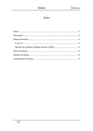 O documento discute sobre dança, definindo-a como movimento rítmico do corpo acompanhado ou não por música. Apresenta a opinião de um professor sobre o ensino da dança na escola e lista diversos tipos de dança como balé clássico, dança moderna e danças tribais. Também aborda estudos de dança e competições de dança.