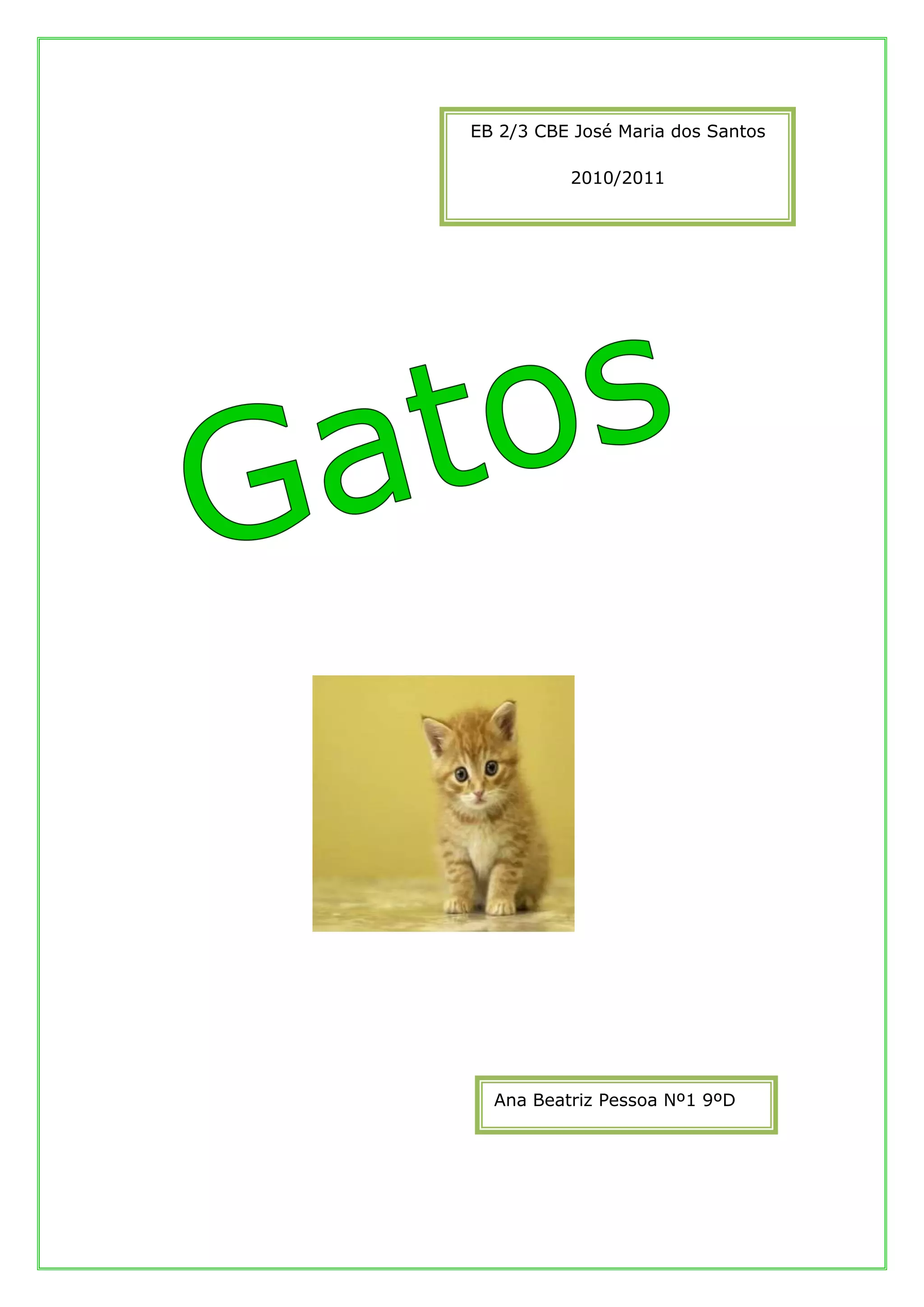 O documento discute as características e comportamento dos gatos domésticos. Aborda tópicos como a história da domesticação dos gatos, suas características físicas, alimentação, higiene, sentidos apurados, envelhecimento e formas de comunicação como miado e ronronar.