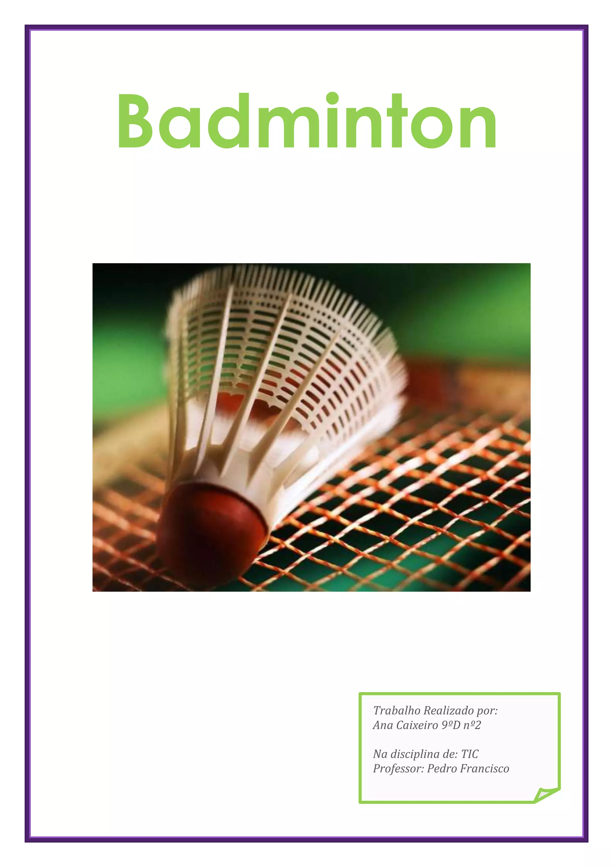 Este documento descreve o esporte de badminton, incluindo sua história, regras, equipamentos e principais jogadores. O badminton é um esporte de raquete individual ou de duplas praticado com uma pena leve através de uma rede, tendo origem na Inglaterra no século XIX. As regras estabelecem que o objetivo é manter a pena voando sobre a rede até o oponente errar. Os principais jogadores mundiais incluem atletas da China, Malásia, Dinamarca e Portugal.