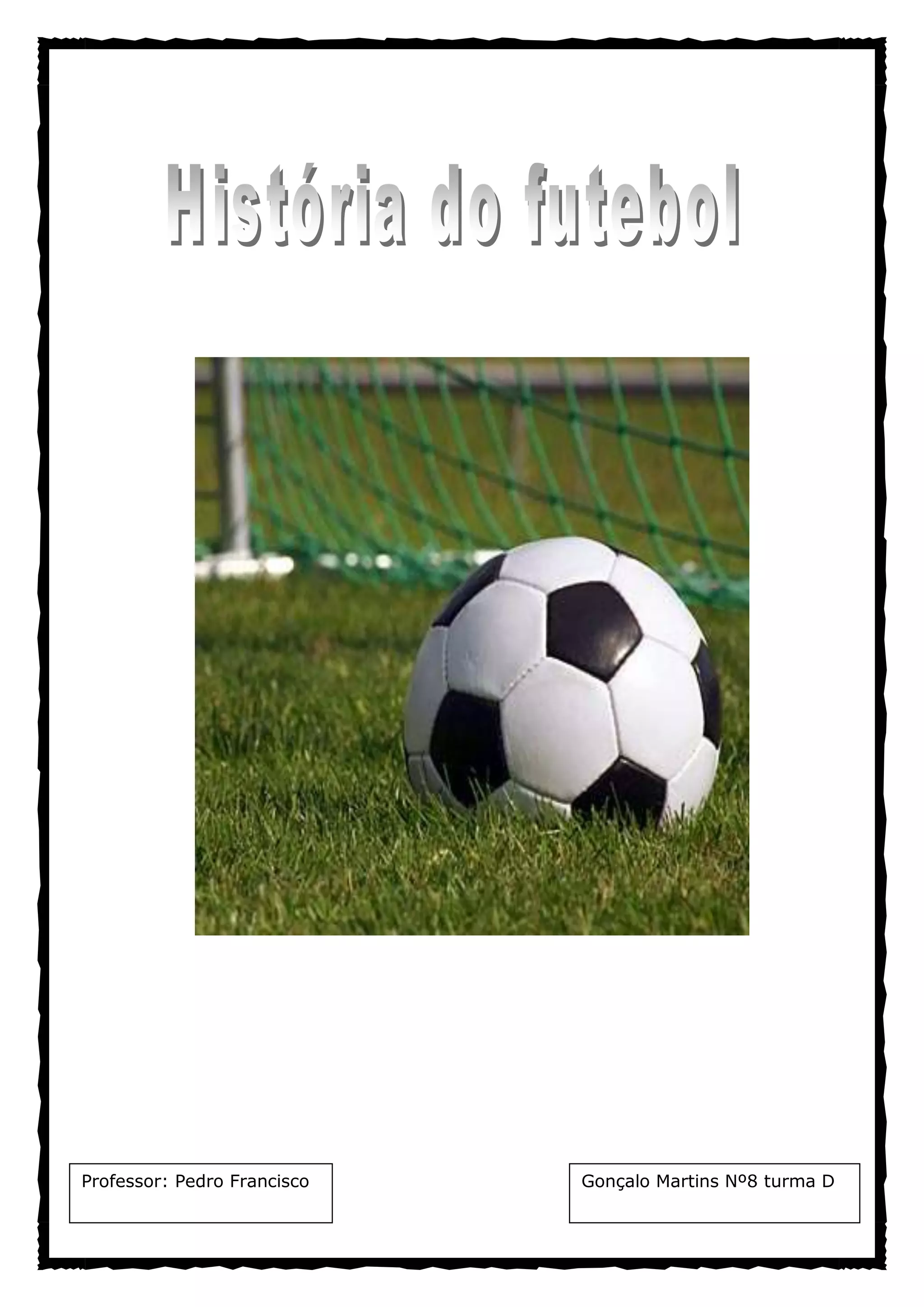 O documento descreve a história do futebol desde suas origens na China Antiga até as regras modernas. Começa com jogos de bola na China, Japão, Grécia e Roma, e depois descreve como o futebol se desenvolveu na Idade Média na Europa até chegar à Inglaterra no século 15. Detalha a criação da FIFA e o estabelecimento das principais regras do jogo no século 19.