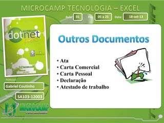 O documento apresenta uma lista de tipos de documentos como ata, carta comercial e carta pessoal. Ele também contém repetidas páginas de aula com informações sobre turma, professor e data.