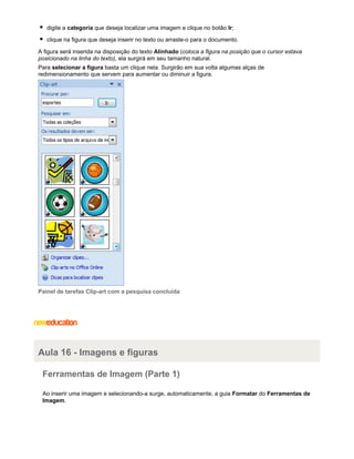 O documento descreve como inserir imagens, figuras e hiperlinks em documentos do Microsoft Word. Ele explica como usar a biblioteca de cliparts, inserir imagens do computador, formatar imagens e como criar e usar modelos e hiperlinks em documentos.