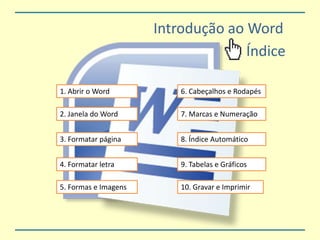 Este documento fornece uma introdução aos principais recursos do Microsoft Word, incluindo como abrir e salvar documentos, formatar páginas e texto, inserir imagens, criar cabeçalhos e rodapés, tabelas e índices.