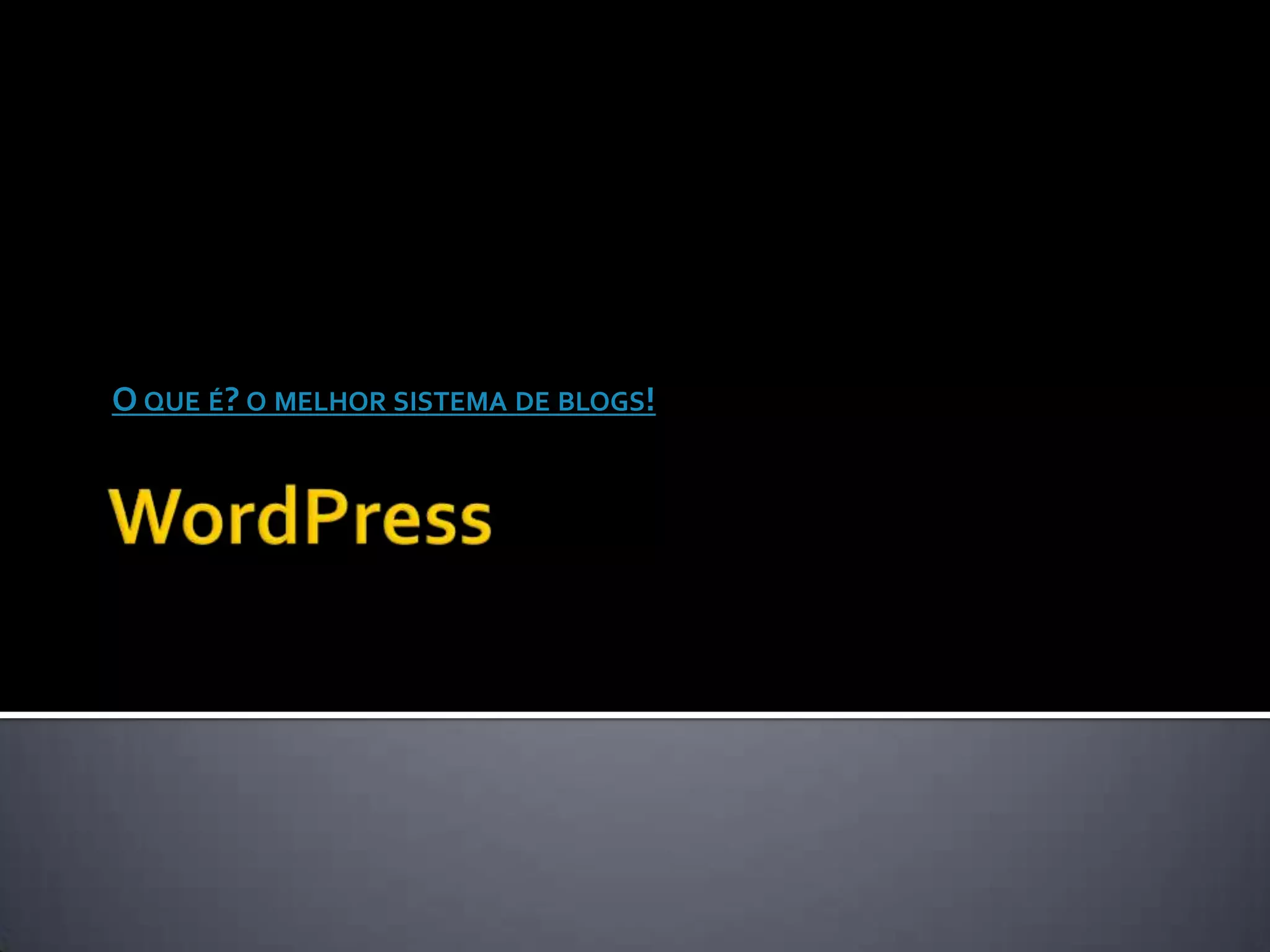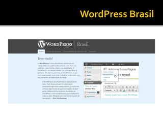 O documento descreve o WordPress como uma plataforma de blogs gratuita e fácil de usar, que permite criar e publicar posts. É desenvolvido em PHP e MySQL e pode ser customizado através de plugins. O WordPress é o sistema de blogs mais popular devido à sua facilidade de uso e adaptabilidade.