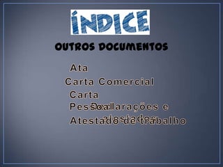 O documento explica diferentes tipos de documentos formais e informais, incluindo atas, cartas comerciais, declarações e atestados, e cartas pessoais. Detalha os requisitos e propósitos de cada um, como assinaturas necessárias, nível de formalidade, e quando cada um é usado.