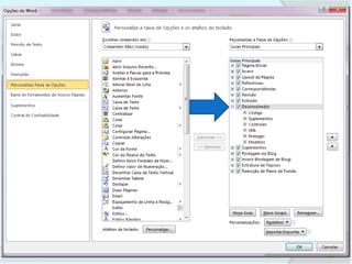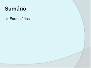 Este documento fornece instruções sobre como criar um formulário em Microsoft Word. Explica como adicionar campos de formulário para nome, endereço e telefone e como configurar as propriedades desses campos. Também instrui os leitores a criar um currículo usando as ferramentas de formulário.