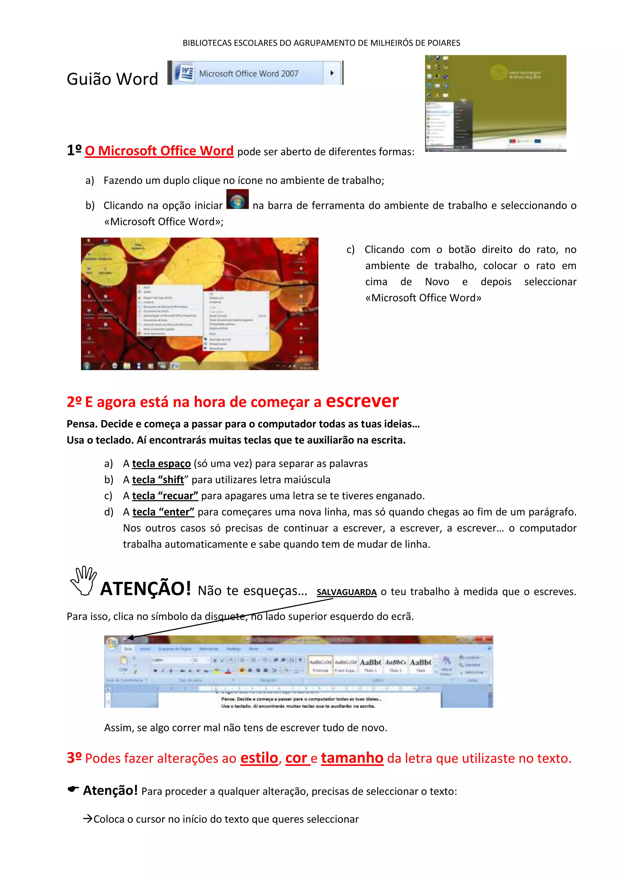 Este documento fornece instruções sobre como usar o Microsoft Word para criar e formatar documentos. Ele explica como abrir e salvar arquivos, escrever texto, formatar fontes, inserir imagens, listas e tabelas, alinhar texto e revisar o trabalho antes de imprimir. O documento contém 11 seções sobre essas funcionalidades básicas do Word.
