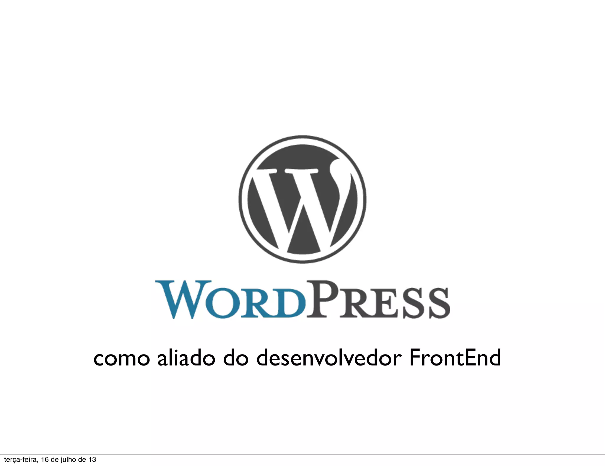 O documento discute o crescimento e uso do WordPress, desde sua origem como plataforma de blog até se tornar uma poderosa plataforma de aplicações. Apresenta funções essenciais como wp_head(), wp_footer() e detalhes sobre templates, menus, scripts e estilos no WordPress.