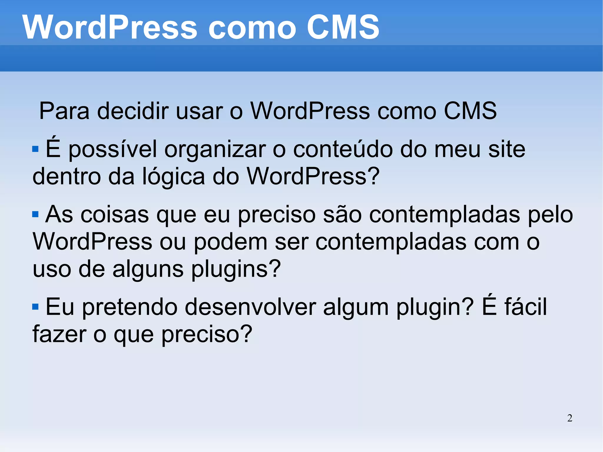 O documento discute as vantagens de usar o WordPress como CMS, destacando sua simplicidade, interface administrativa intuitiva e uma grande comunidade de suporte. Também aborda como organizar o conteúdo, utilizar plugins e desenvolver temas, além de exemplificar a flexibilidade da plataforma através de APIs e a facilidade na criação de plugins. Por fim, menciona limitações, como permissões de usuários e opções de multi-idioma.