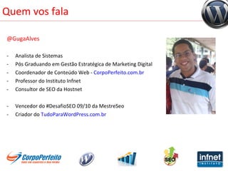 Este documento fornece dicas sobre otimização para mecanismos de busca (SEO) no WordPress. Ele recomenda plugins para segurança, otimização de banco de dados e imagens, além de dicas sobre arquitetura de site, meta tags, links internos e externo e propagação de conteúdo.