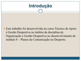 O documento discute os fundamentos da comunicação, incluindo definições, modelos e funções. Também aborda a gestão da comunicação através do planejamento de marketing e comunicação, identificando ferramentas como publicidade, marketing direto, relações públicas e promoções.