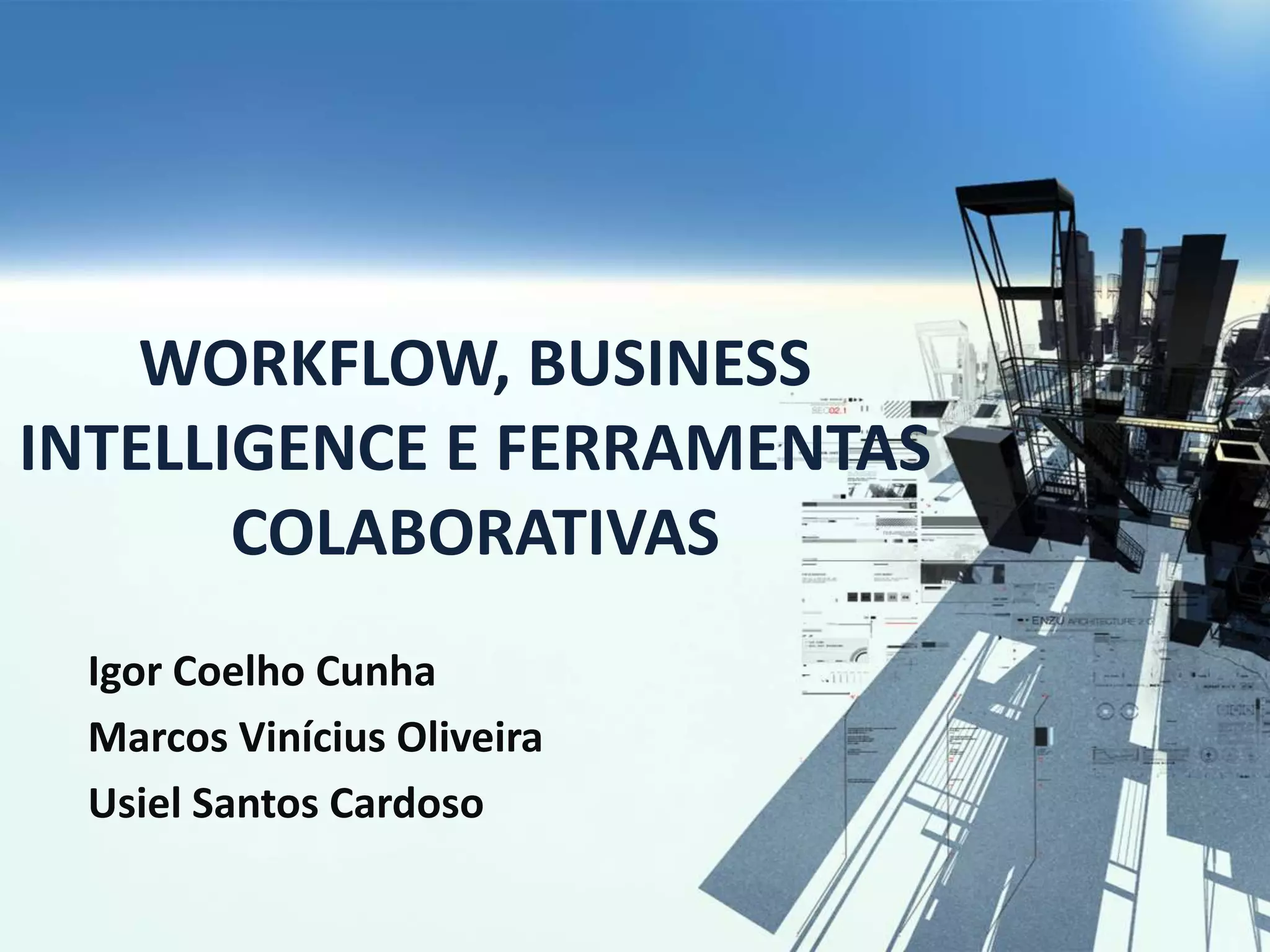 O documento discute workflow, business intelligence e ferramentas colaborativas. Apresenta workflow como a automação de processos de negócio através de sequências de passos. Discute também os objetivos e meios do workflow como melhorar produtividade e eliminar ineficiências. Business intelligence é definido como permitir tomadas de decisões proativas ao gerar e disponibilizar informações necessárias ao negócio no momento certo através da extração e análise de dados.
