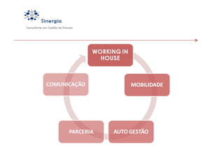 O documento discute o trabalho remoto ("working in house") onde funcionários podem responder e-mails e acessar sistemas internos remotamente. Oferece vantagens como aumento da produtividade e flexibilidade para empresas, mas pode ser difícil de supervisionar. Para a sociedade, pode reduzir poluição e congestionamento mas ter efeito negativo no setor imobiliário com menos necessidade de espaço físico para escritórios.