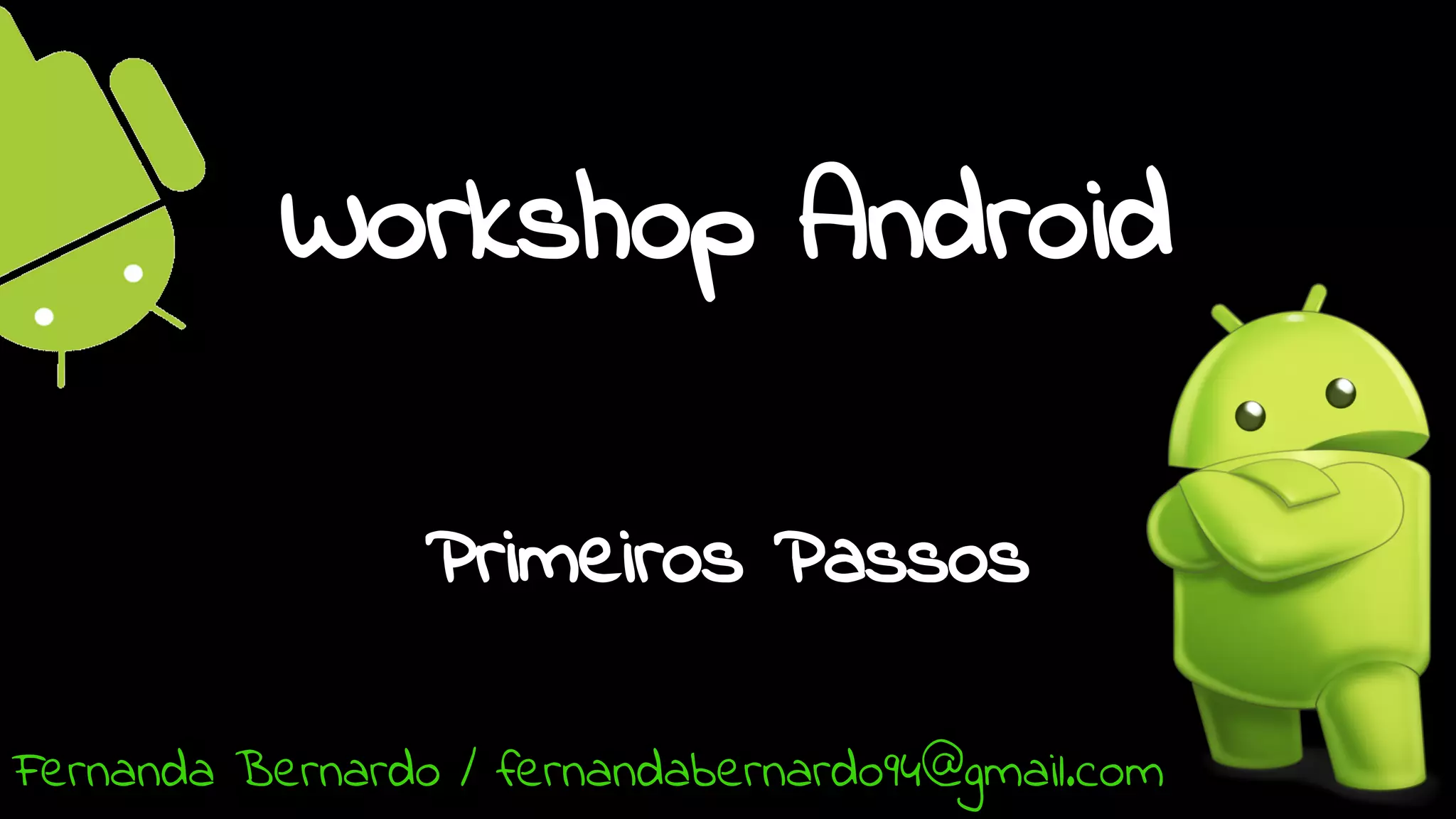 O documento apresenta um workshop sobre os primeiros passos no desenvolvimento de aplicativos Android, abordando a estrutura de projetos Android, o ciclo de vida de activities, layouts XML e conceitos básicos de programação orientada a objetos como classes, atributos e métodos.