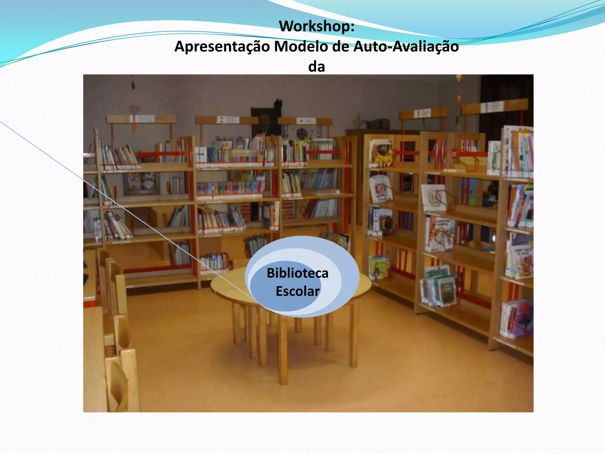 O documento apresenta um modelo de auto-avaliação para bibliotecas escolares com o objetivo de avaliar o trabalho desenvolvido e identificar áreas de sucesso e melhoria. O modelo inclui quatro domínios principais: apoio ao desenvolvimento curricular, leitura e literacia, projetos e parcerias, e gestão da biblioteca. A aplicação do modelo envolve recolha de evidências, análise dos dados, elaboração de um relatório e implementação de um plano de ação.