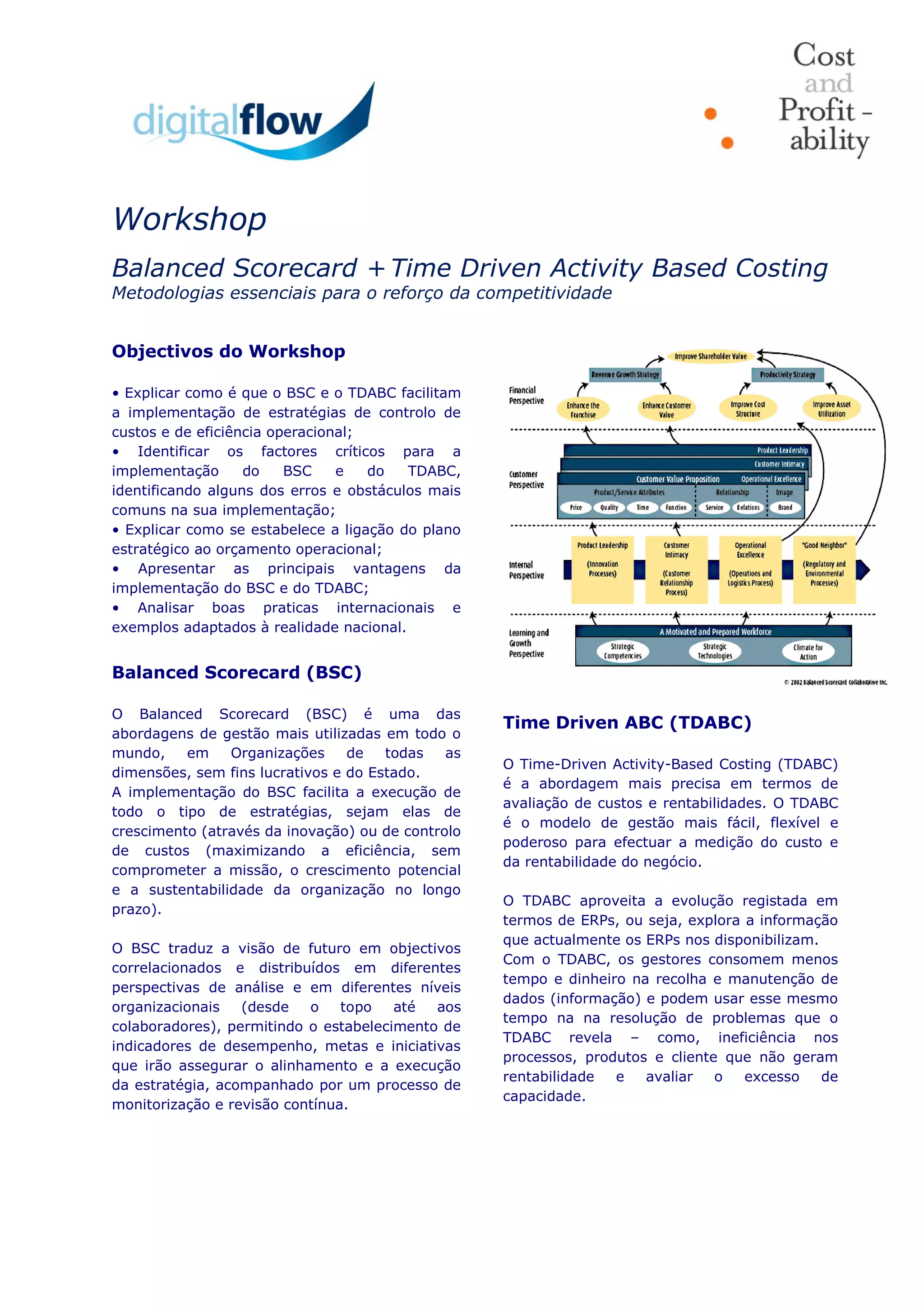 Este documento descreve um workshop sobre o Balanced Scorecard (BSC) e o Time-Driven Activity-Based Costing (TDABC). O workshop tem como objetivos explicar como estas metodologias facilitam a implementação de estratégias de controlo de custos e eficiência, identificar fatores críticos e exemplos de aplicação prática. O programa inclui fundamentos, implementação do BSC e TDABC e um caso prático.