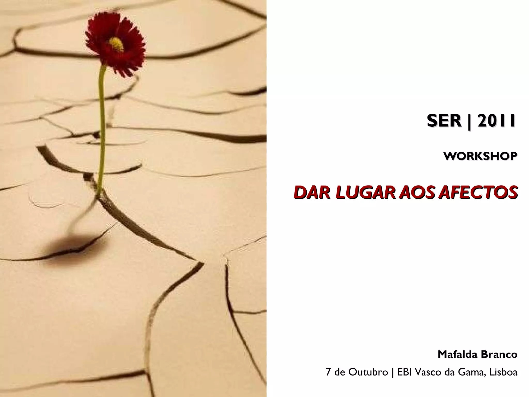 O documento apresenta o programa de um workshop sobre dar lugar aos afetos que irá ocorrer no dia 7 de outubro no EBI Vasco da Gama em Lisboa. O programa inclui uma citação sobre a ligação entre corpo e mente e sessões sobre o lugar dos afetos, desenhar sentimentos, contar histórias, colagem, canções, poemas, músicas e a família.