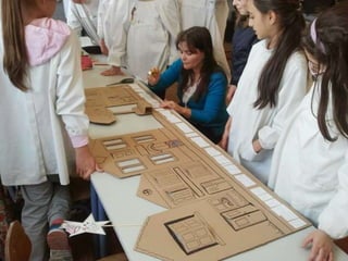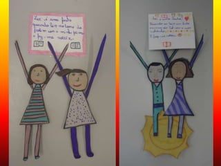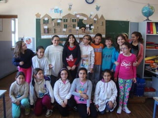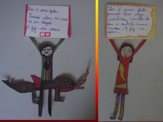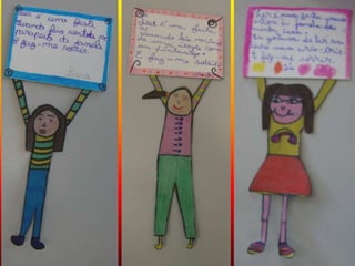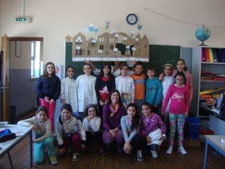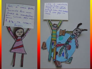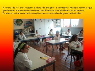 A turma do 4o ano recebeu uma visita da ilustradora Anabela Pedrosa para uma atividade onde criaram um bairro imaginário através de bonecos e cartazes, com a frase "Ler é uma festa quando...". Os alunos trabalharam com a ajuda da professora para completar o projeto, celebrando a leitura através de seus habitantes.