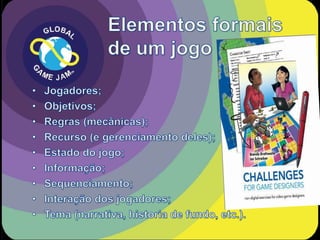 #14 Algumas pessoas também usam “Mecânica, Dinâmica, Estética”Ver o modelo MDA de Robin Hunicke, Marc LeBlanc, Robert Zubekhttp://www.cs.northwestern.edu/~hunicke/MDA.pdf