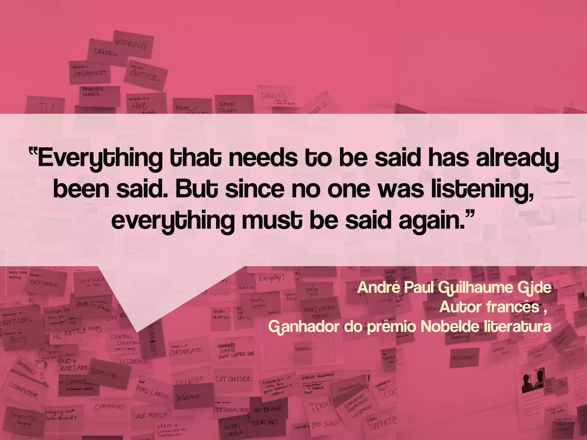 O autor francês André Gide afirma que embora tudo que precisa ser dito já tenha sido dito, como ninguém estava ouvindo, tudo precisa ser dito novamente. Ele ganhou o Prêmio Nobel de Literatura.