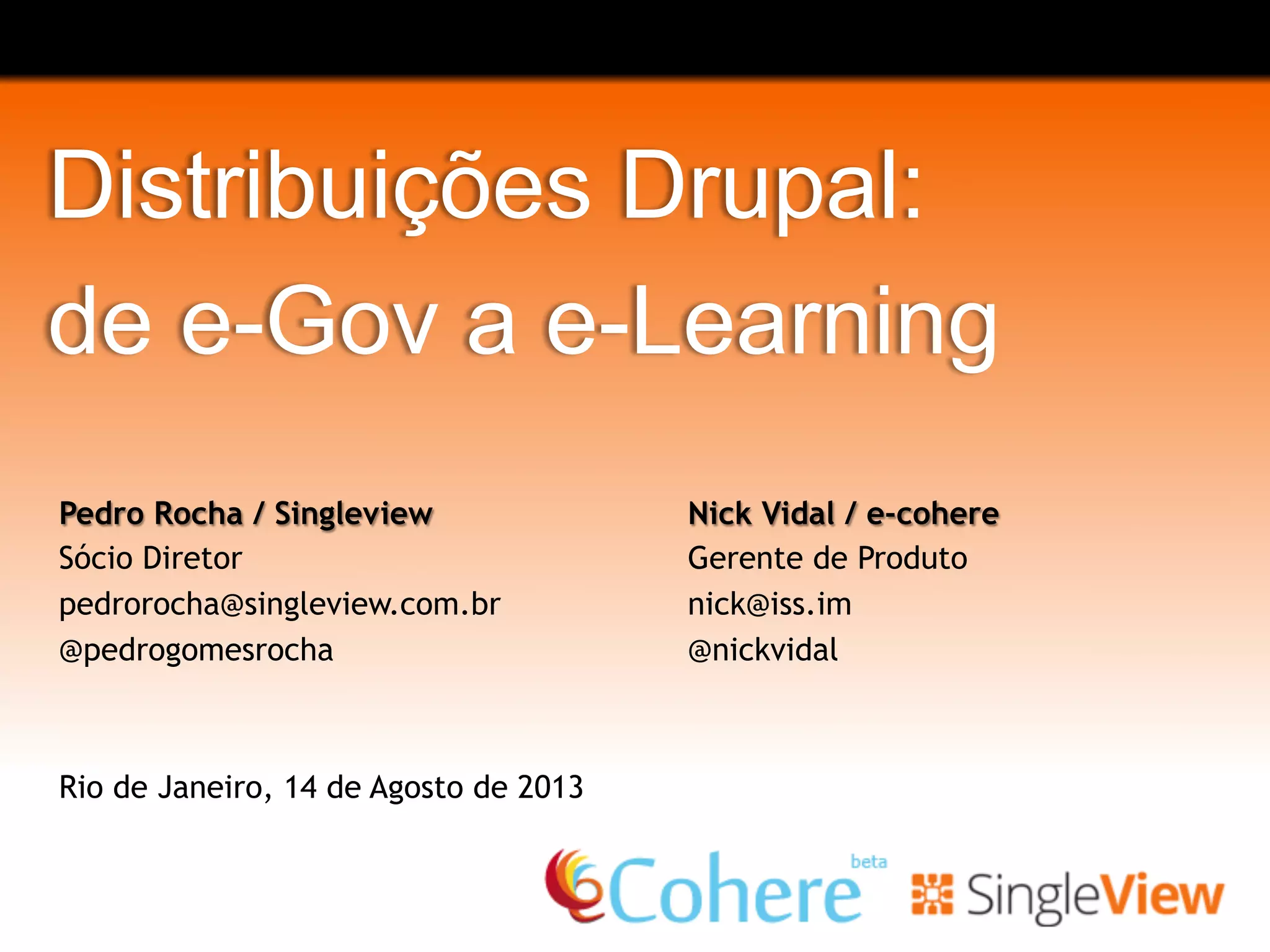 O documento apresenta uma visão geral sobre o Drupal, destacando suas funcionalidades como um sistema de gerenciamento de conteúdo (CMS) e sua natureza como uma plataforma modular. Discute as 'distros' do Drupal, que são versões pré-configuradas para usos específicos, e fornece exemplos de diversas distros voltadas para áreas como e-learning, e-governança e comércio eletrônico. Os autores, Pedro Rocha e Nick Vidal, compartilham suas experiências e contribuições na comunidade Drupal.