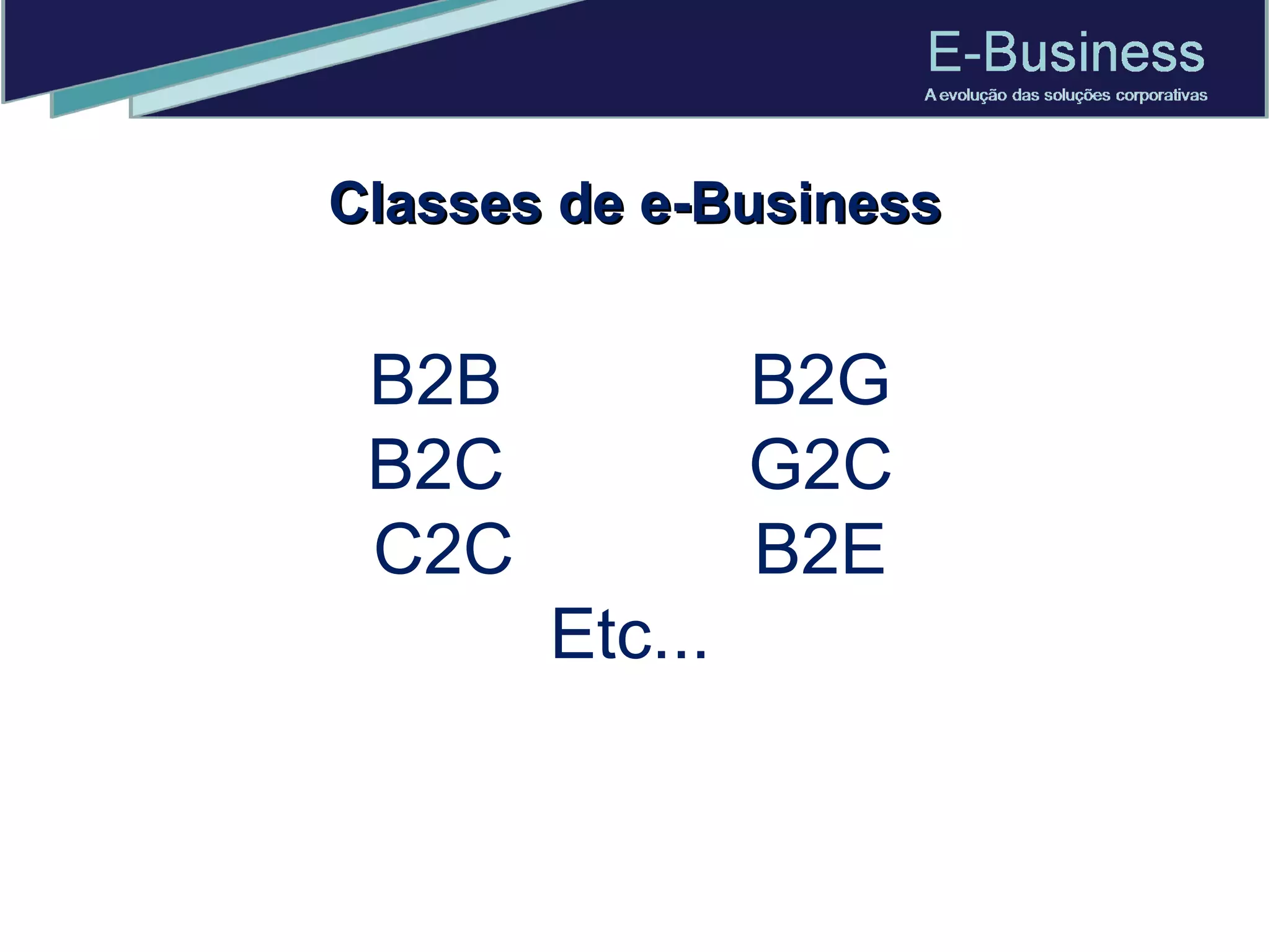 O documento discute as principais classes de e-business (B2B, B2C, C2C etc.), explica o que são intranet, extranet e internet móvel e como as empresas os utilizam. Também aborda o uso de blogs e redes sociais pelas empresas para fins de marketing e relacionamento com clientes.