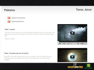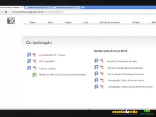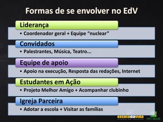 O documento descreve um projeto de capelania escolar chamado "Escola da Vida" que tem como objetivo resgatar valores entre estudantes. O projeto inclui atividades como um lanche para professores, concurso de redação, palestras, evento cultural, envio de cartas para estudantes, e uma palestra para pais. O principal objetivo é compartilhar o evangelho cristão com a comunidade escolar.