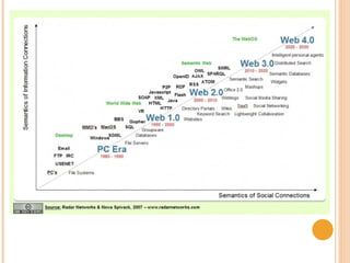 O documento descreve as principais ferramentas da Web 2.0 que podem ser usadas em ambientes de ensino e aprendizagem, incluindo redes sociais, wikis, blogs e plataformas de e-learning. Também discute como essas ferramentas podem tornar a escola mais interativa, colaborativa e acessível.
