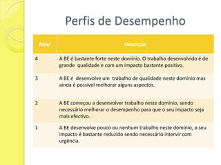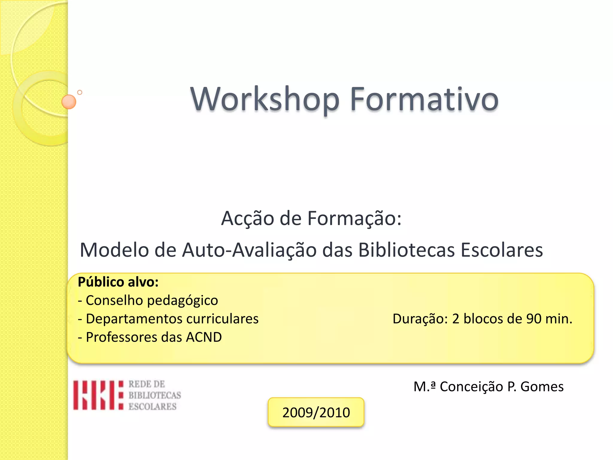 Este documento descreve um workshop sobre a implementação de um modelo de auto-avaliação para bibliotecas escolares. O modelo visa fornecer uma ferramenta de melhoria contínua permitindo avaliar o trabalho da biblioteca e seu impacto na escola. O workshop discute conceitos como avaliação, recolha de evidências e perfis de desempenho para identificar áreas de sucesso e de melhoria.