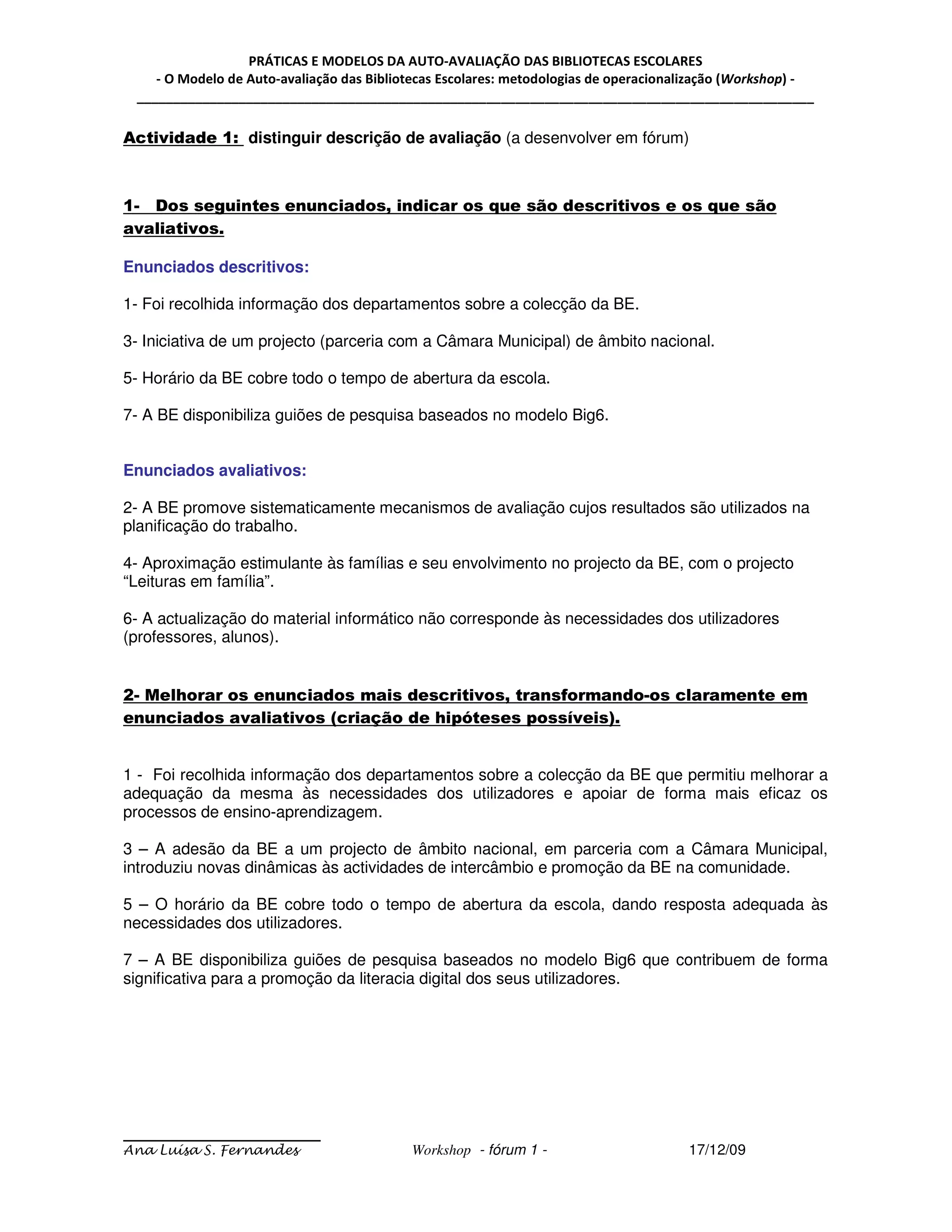 Este documento discute práticas e modelos de auto-avaliação de bibliotecas escolares. Ele fornece exemplos de enunciados descritivos e avaliativos sobre bibliotecas escolares e pede para transformar alguns enunciados descritivos em avaliativos, sugerindo como a informação descrita pode ser usada para avaliar a biblioteca.