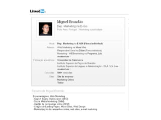 Miguel Brandão, especialista em marketing, possui mais de 9 anos de experiência em negócios online e é fundador do website maiswebmarketing.com. O documento discute conceitos fundamentais da internet e da web, além de apresentar estratégias e ferramentas de marketing digital, incluindo SEO, PPC e marketing de afiliados. Também aborda a importância da análise de palavras-chave e a otimização de conteúdo para diferentes plataformas.