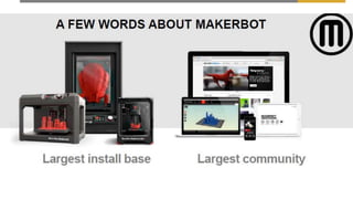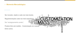 O documento aborda a impressão 3D, destacando seu momento mercadológico com ênfase na customização em massa e inovação. Apresenta aplicações práticas em setores como manufatura, entretenimento e medicina, além de exemplos de sucesso, como a MakerBot. Discute ainda a transformação dos processos industriais e educacionais com o uso dessa tecnologia emergente.